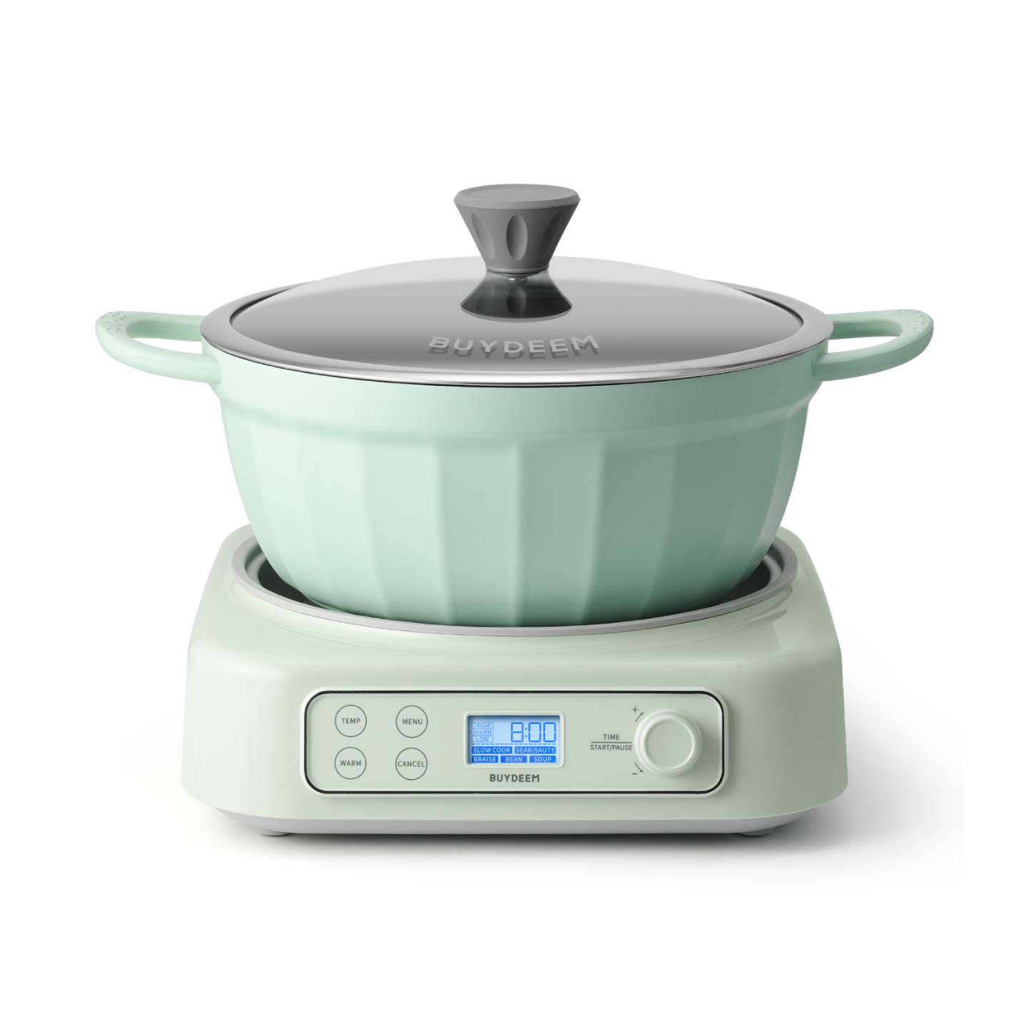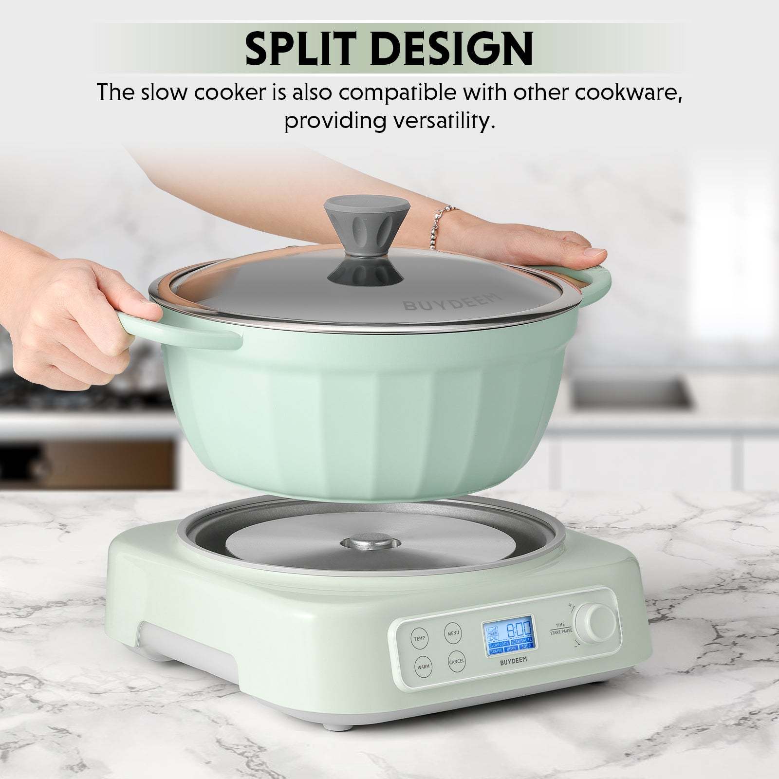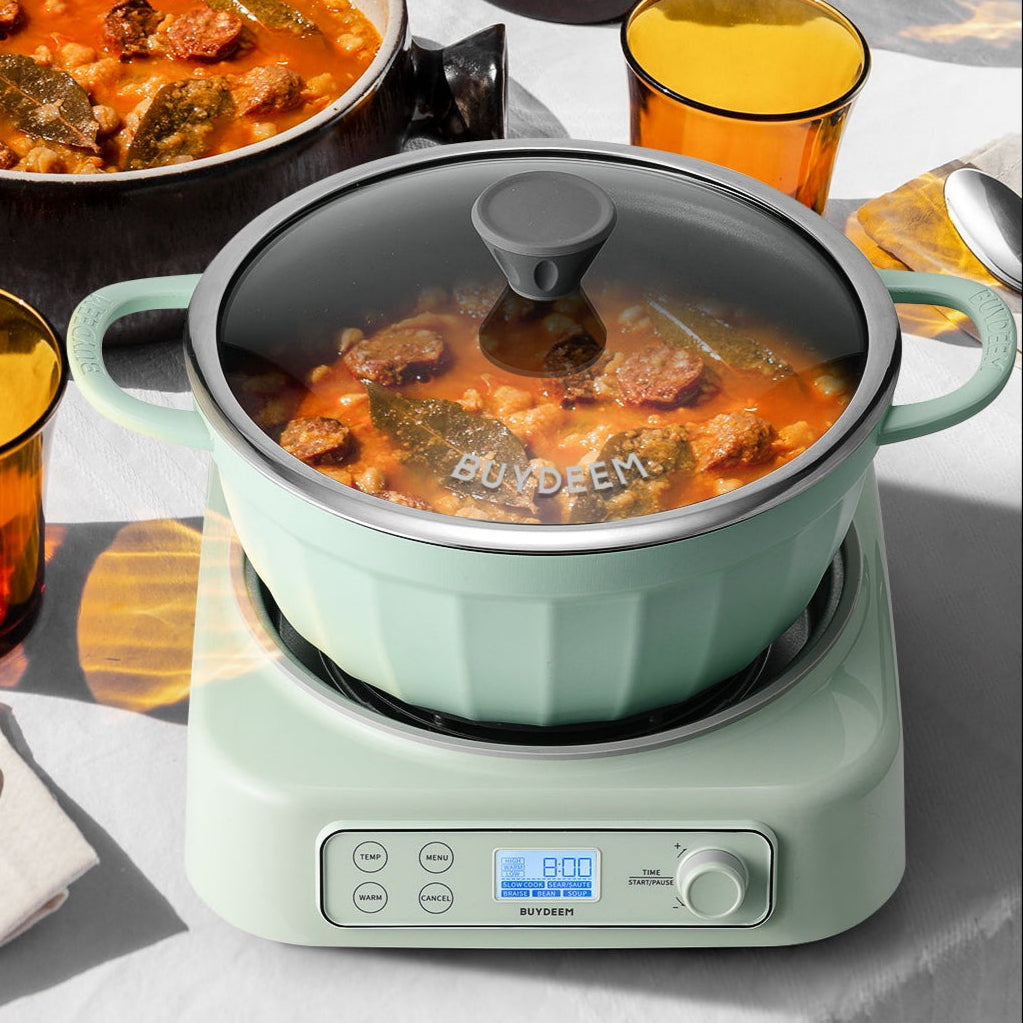 This versatile slow cooker has five functions: slow cook, sear/ sauté, braise, bean, and soup - all in one. Paired with the BUYDEEM CP152 non-stick pot 4.7qt, practical and stylish.