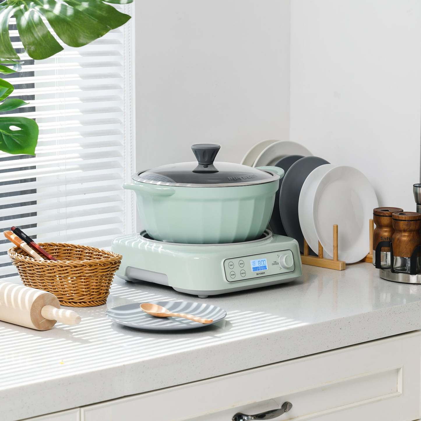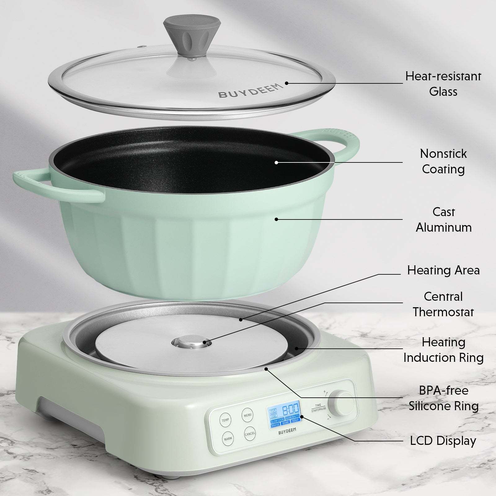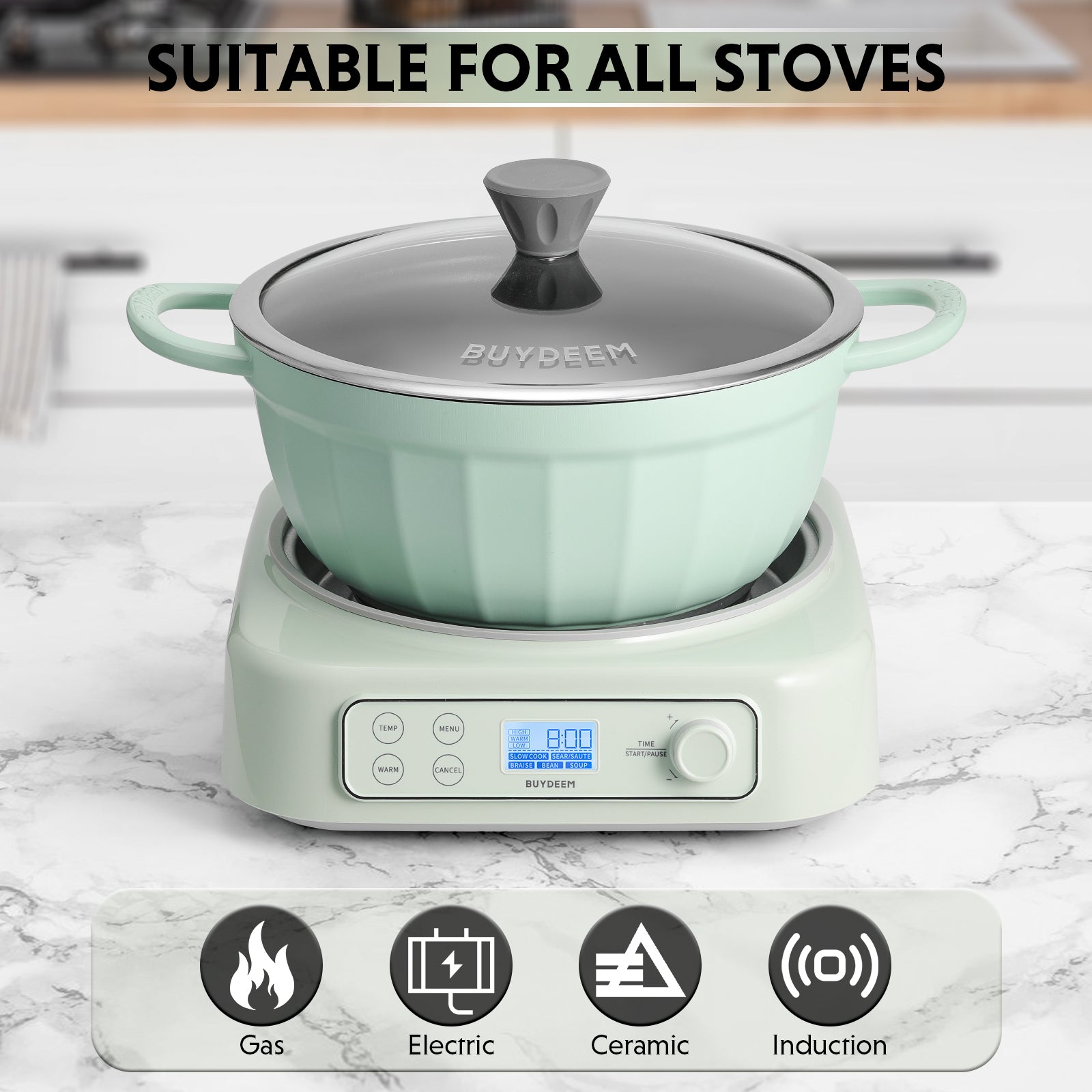 This versatile slow cooker has five functions: slow cook, sear/ sauté, braise, bean, and soup - all in one. Paired with the BUYDEEM CP152 non-stick pot 4.7qt, practical and stylish.