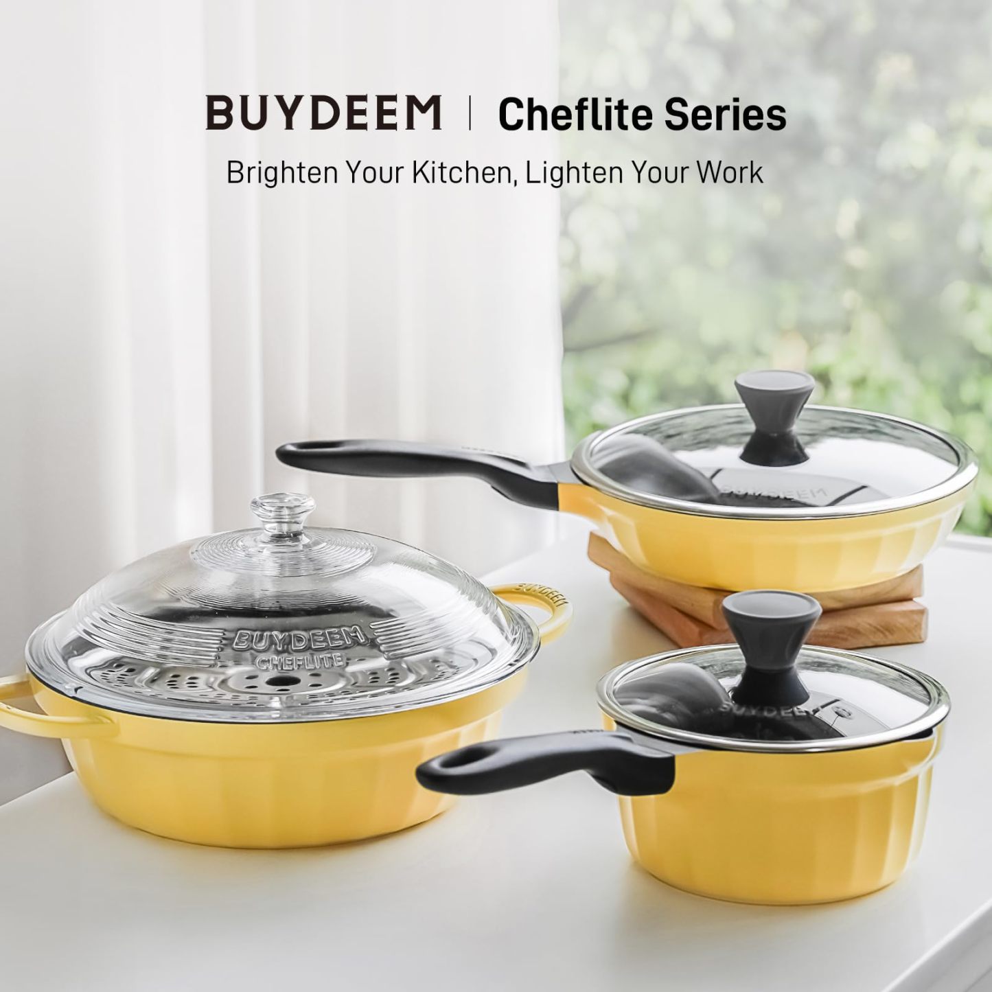 Lightweight cast aluminum saucepan with fast heat distribution, nonstick coating, and compatibility with all stovetops. Built-in spout for easy pouring. Effortless to clean.