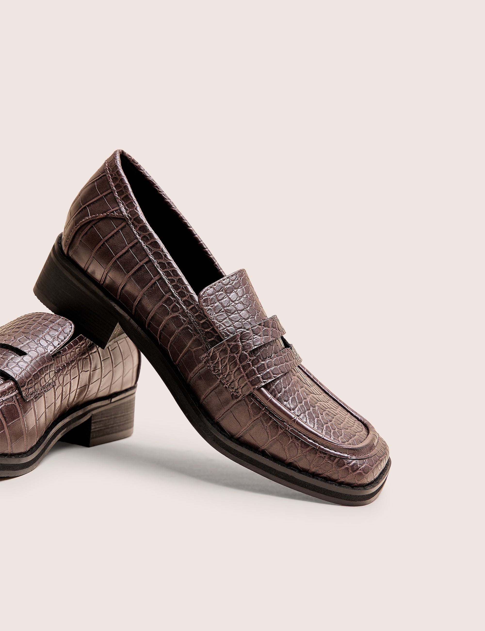 Make a sophisticated statement with the Decaf Brown Croc Square Toe Penny Loafer. Featuring a stylish croc-embossed texture and modern square toe, these loafers offer a fresh take on a classic design. The rich brown colour adds warmth and versatility, effortlessly elevating both casual and professional outfits. Enjoy timeless style paired with comfortable wear for all-day confidence.
