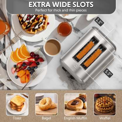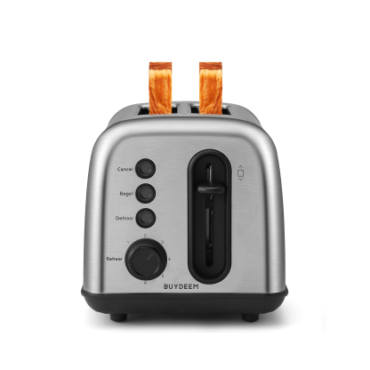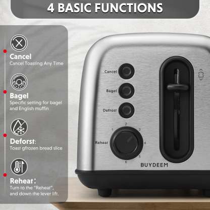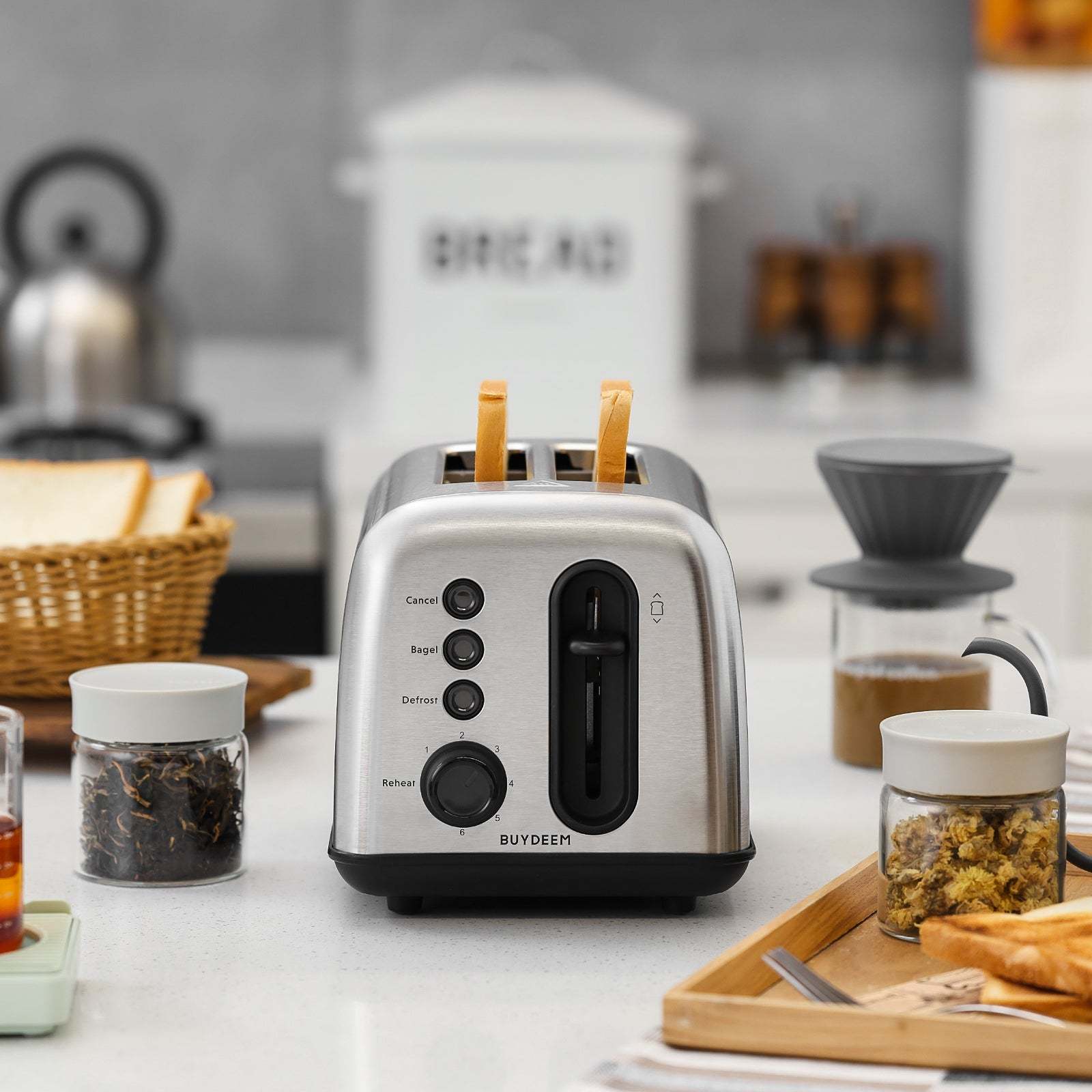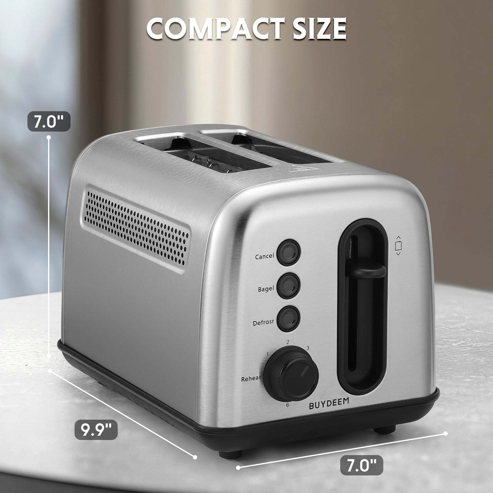 Compact 2-slice toaster with 1.5' wide slots, 6 shade settings, 4 functions & high-lift lever—space-saving and perfect for daily use.