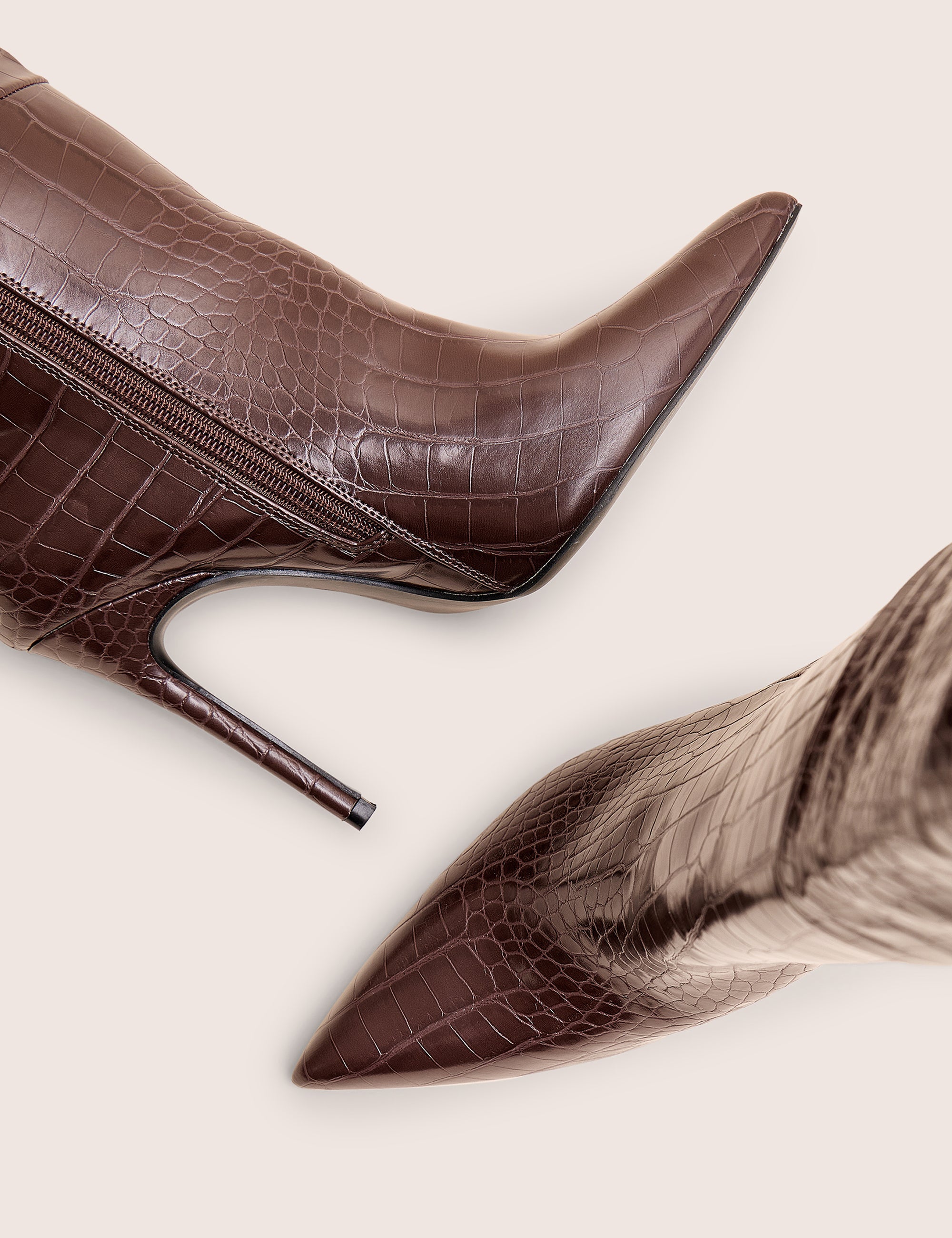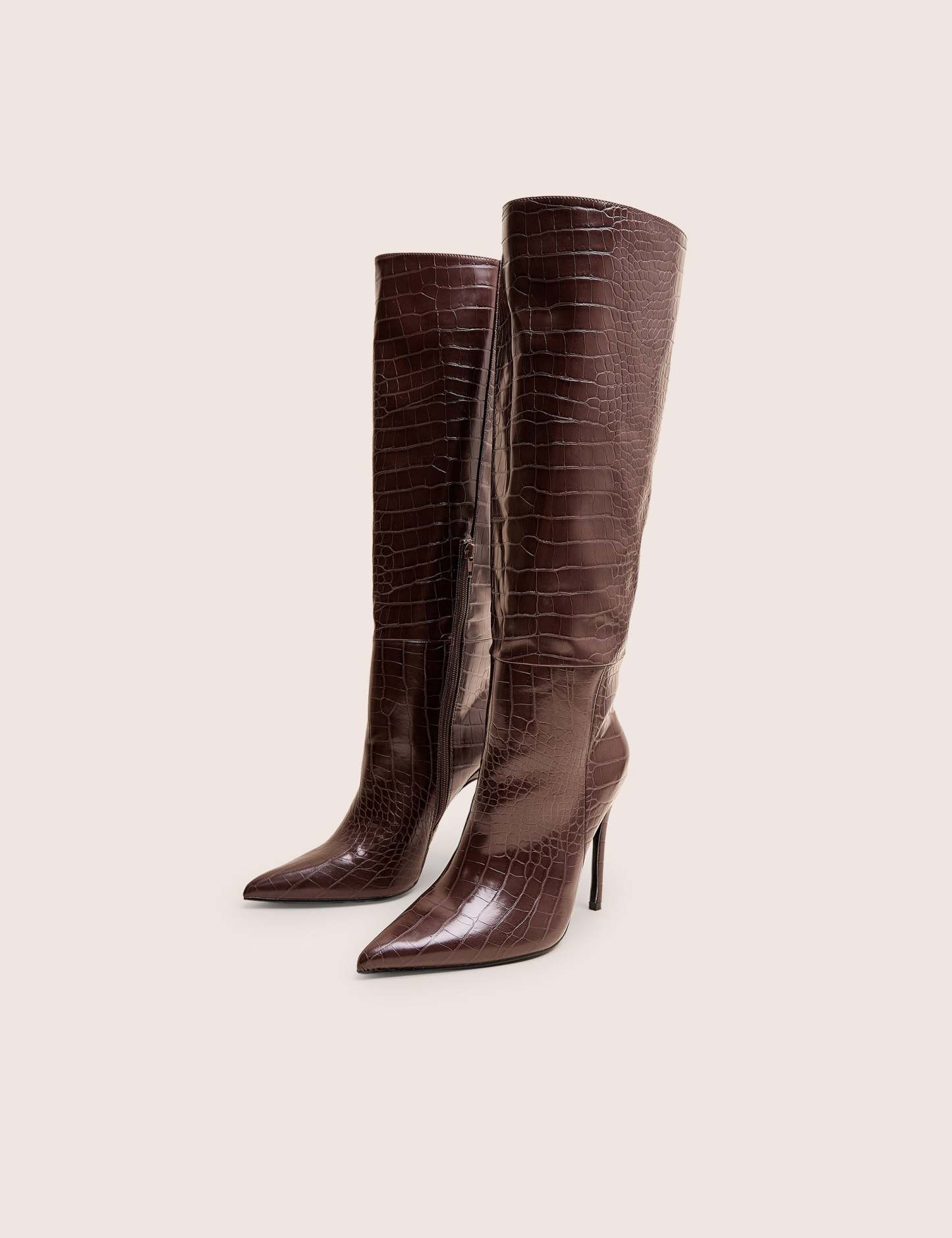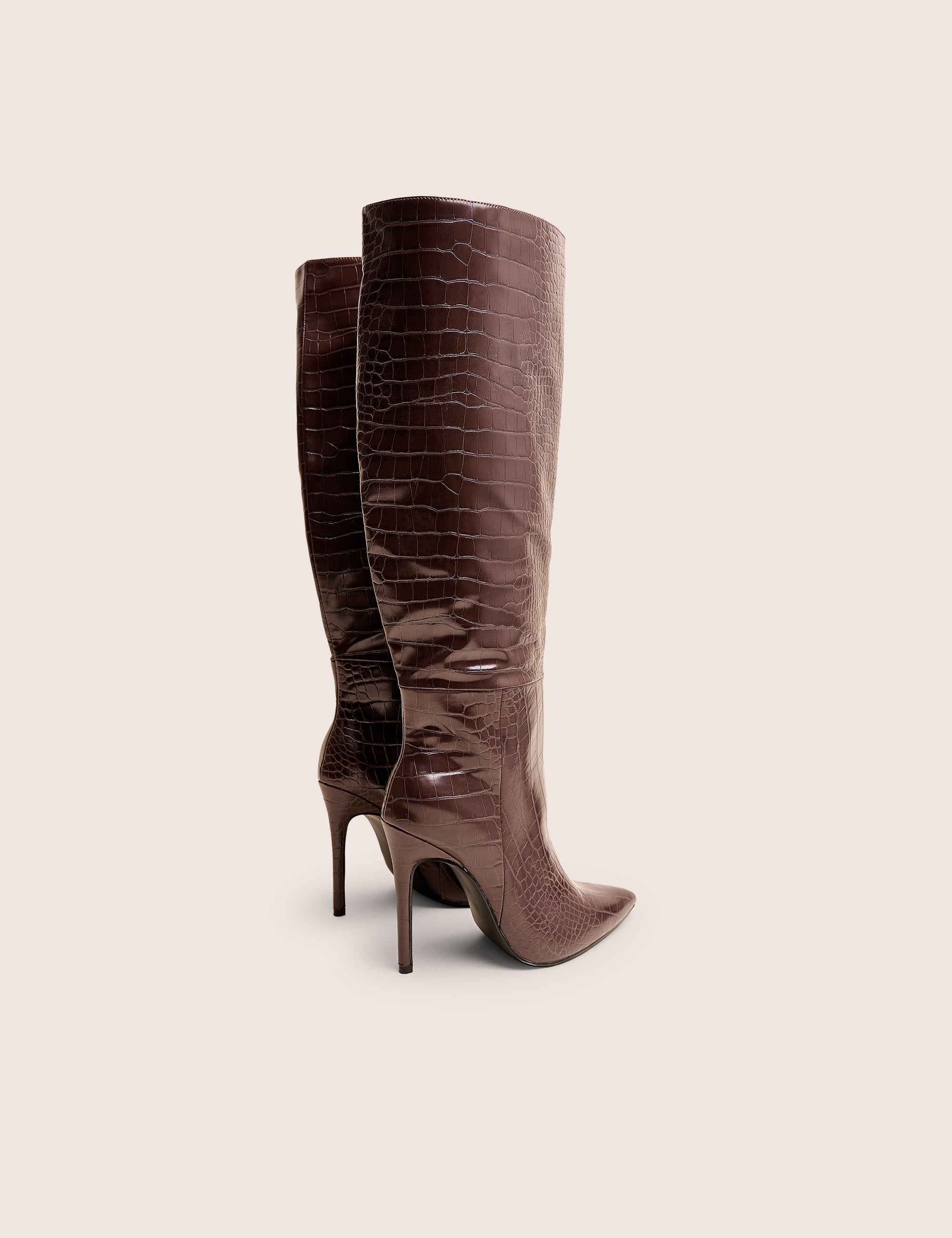 Command attention with the Nova Chocolate Brown Croc Knee High Stiletto Boots. Featuring luxurious croc-embossed texture and a sleek knee-high design, these boots add a touch of refined edge to any outfit. The rich chocolate brown hue paired with a sharp stiletto heel creates a striking silhouette that elevates your look instantly. Perfect for making a confident, stylish statement day or night.