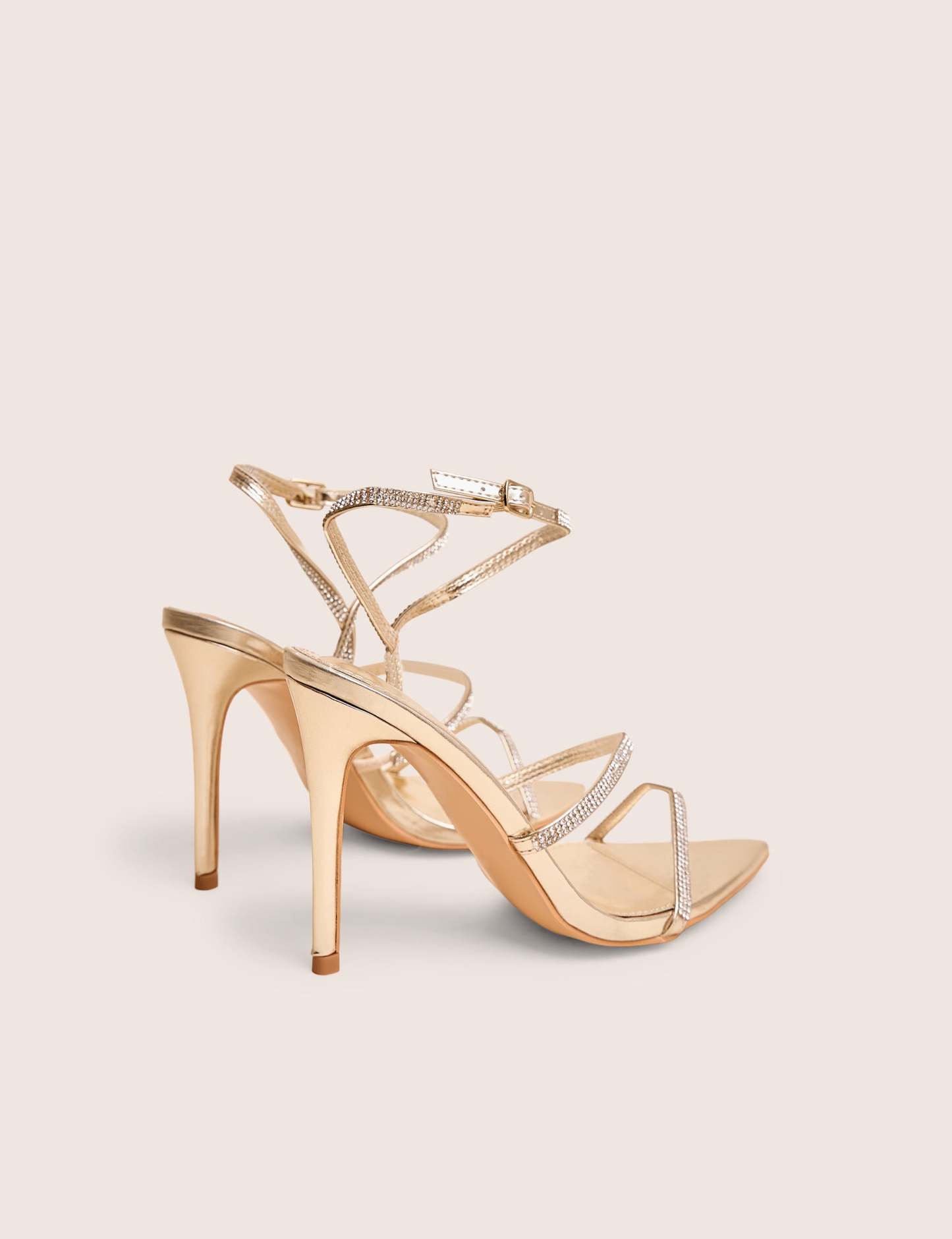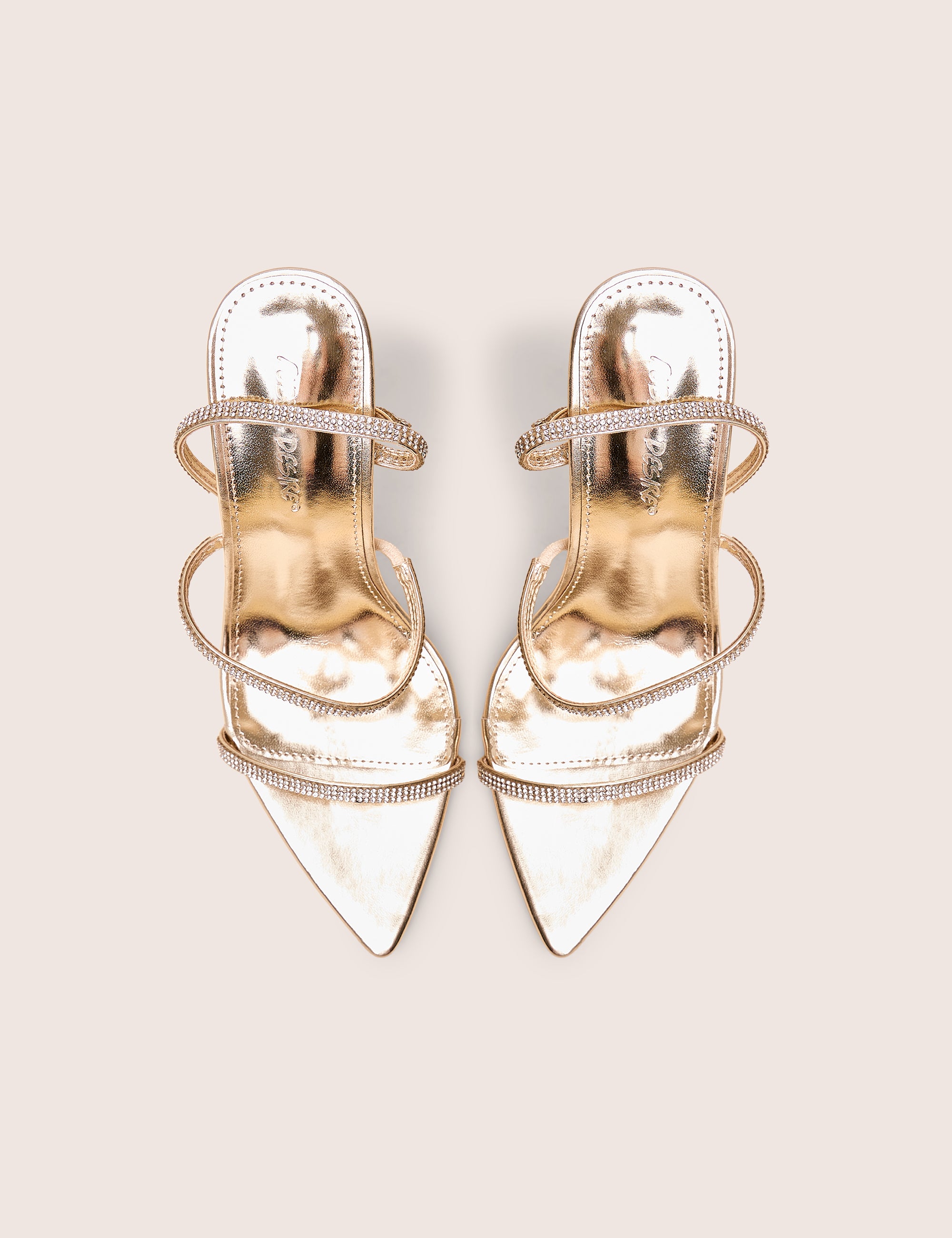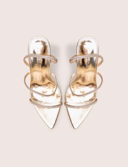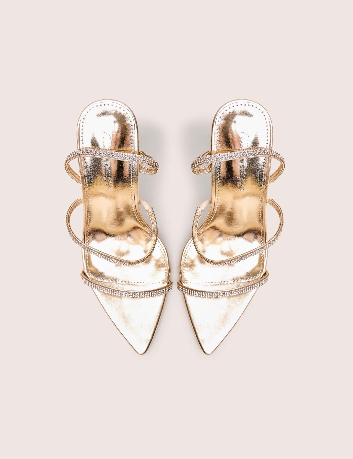 Elevate your style with these Seductive Gold Mirror PU Diamante Strap Stilettos. Featuring a pointed toe and sparkling diamante straps, they add a glamorous edge to any outfit. The high stiletto heel enhances your silhouette, perfect for making a confident statement at any event.